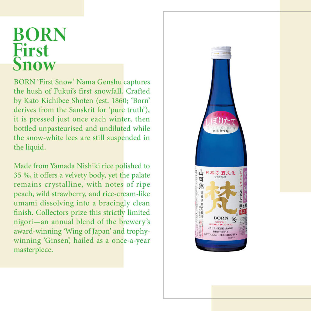 BORN “First Snow” Nama Genshu captures the hush of Fukui’s first snowfall. Crafted by Kato Kichibee Shoten (est. 1860; “Born” derives from the Sanskrit for “pure truth”), it is pressed only once each winter, then bottled unpasteurized and undiluted while the milky, snow-like lees remain suspended in the liquid.