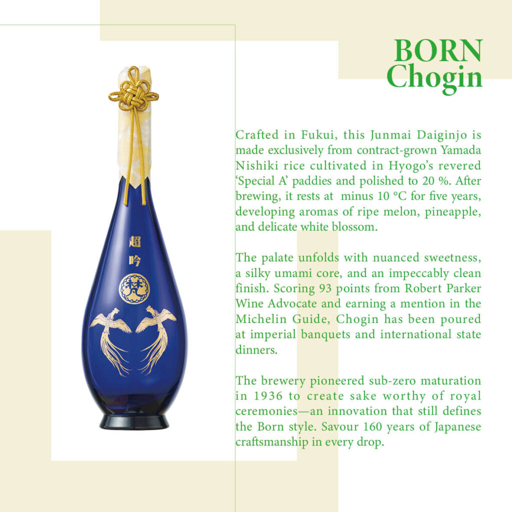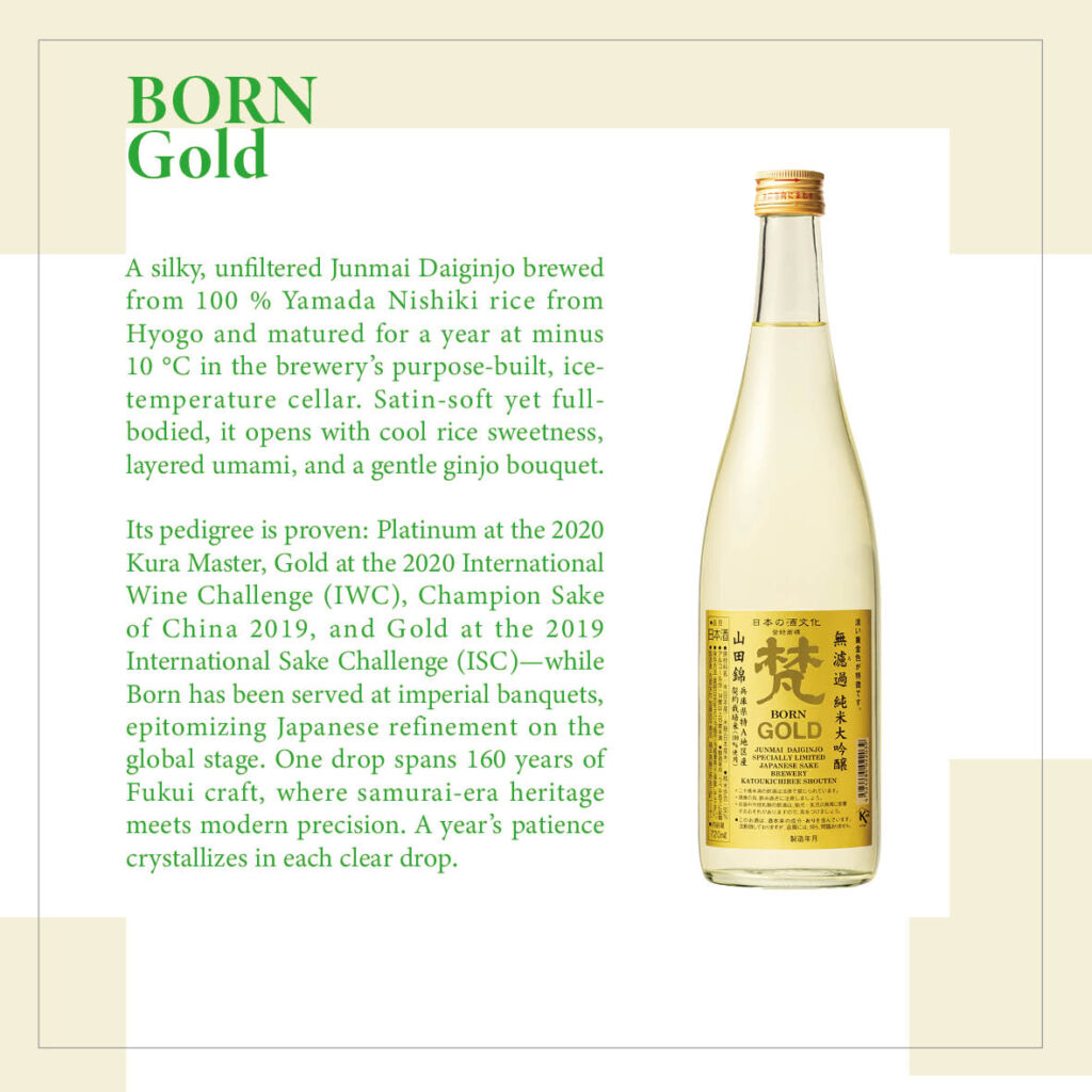 Its pedigree is proven: Gold at the 2019 International Sake Challenge (ISC), Champion Sake of China 2019, Platinum at the 2020 Kura Master, and Gold at the 2020 International Wine Challenge (IWC). Born has even been served at imperial banquets, epitomizing Japanese refinement on the global stage. One drop carries 160 years of Fukui craft, where samurai-era heritage meets modern precision—a year’s patience crystallized in every clear drop.
