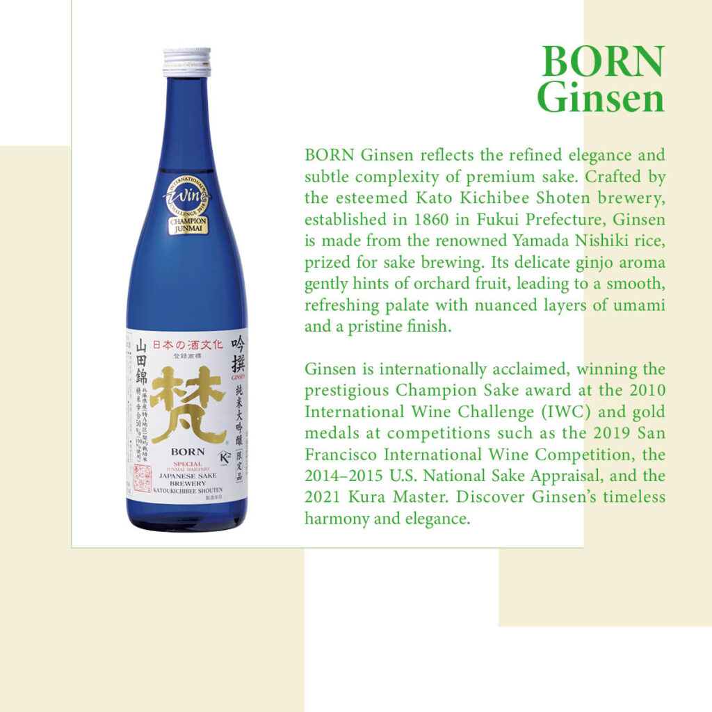 BORN Ginsen embodies the refined elegance and subtle complexity of premium sake. Crafted by the esteemed Kato Kichibee Shoten brewery, established in 1860 in Fukui Prefecture, it is made from renowned Yamada Nishiki rice, prized among sake brewers. Its delicate ginjo aroma carries gentle hints of orchard fruit, leading to a smooth, refreshing palate with nuanced layers of umami and a pristine finish.