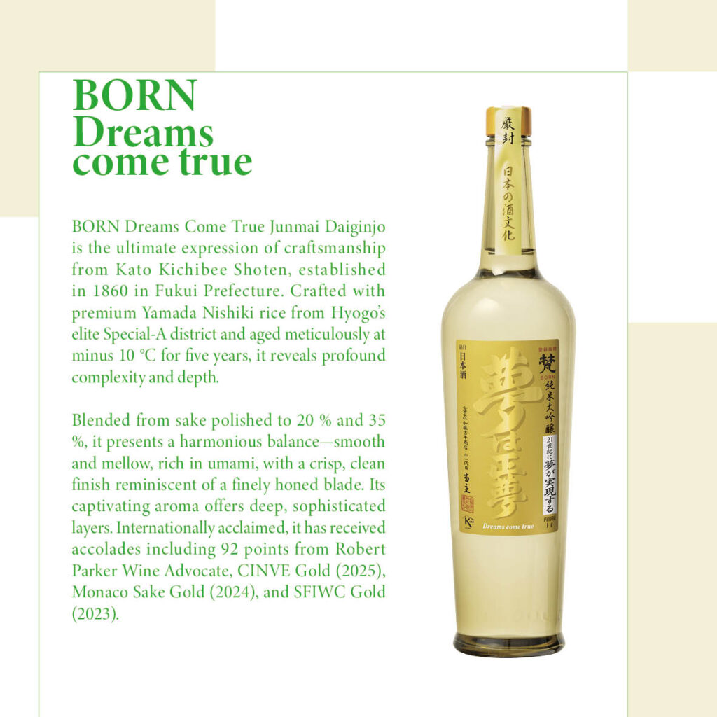 BORN Dreams Come True Junmai Daiginjo is the ultimate expression of craftsmanship from Kato Kichibee Shoten, established in 1860 in Fukui Prefecture. Crafted with premium Yamada Nishiki rice from Hyogo’s elite Special-A district and aged meticulously at −10°C for five years, it reveals profound complexity and depth.