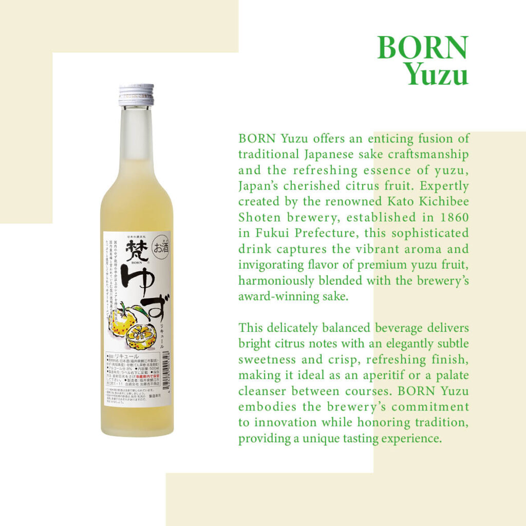 BORN Yuzu offers a refined fusion of traditional Japanese sake craftsmanship and the vibrant essence of yuzu, Japan’s iconic citrus. Expertly crafted by the renowned Kato Kichibee Shoten brewery, established in 1860 in Fukui Prefecture, it captures the fragrant aroma and invigorating flavor of premium yuzu, seamlessly blended with the brewery’s award-winning sake.