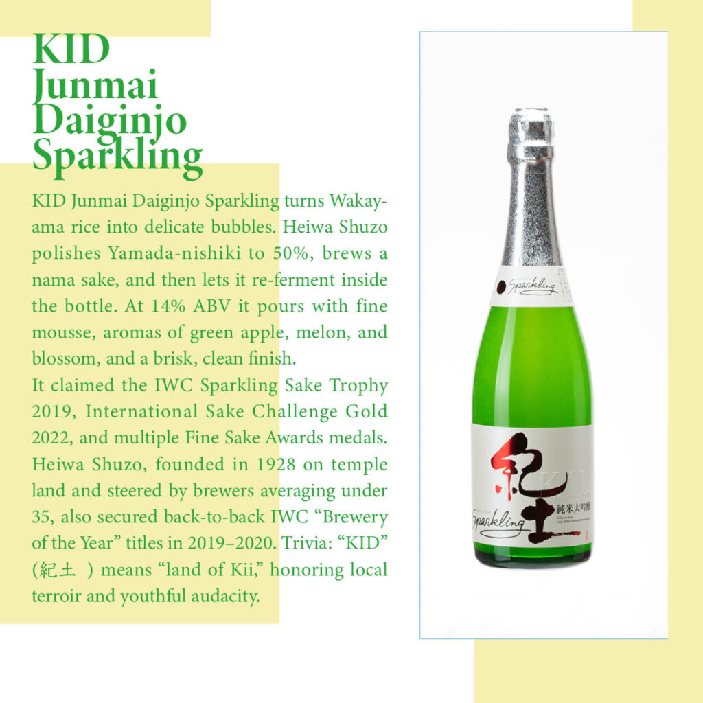 KID Junmai Daiginjo Sparkling turns Wakayama rice into delicate bubbles. Heiwa Shuzo polishes Yamada-nishiki to 50%, brews a nama sake, and then lets it re-ferment inside the bottle. At 14% ABV it pours with fine mousse, aromas of green apple, melon, and blossom, and a brisk, clean finish.