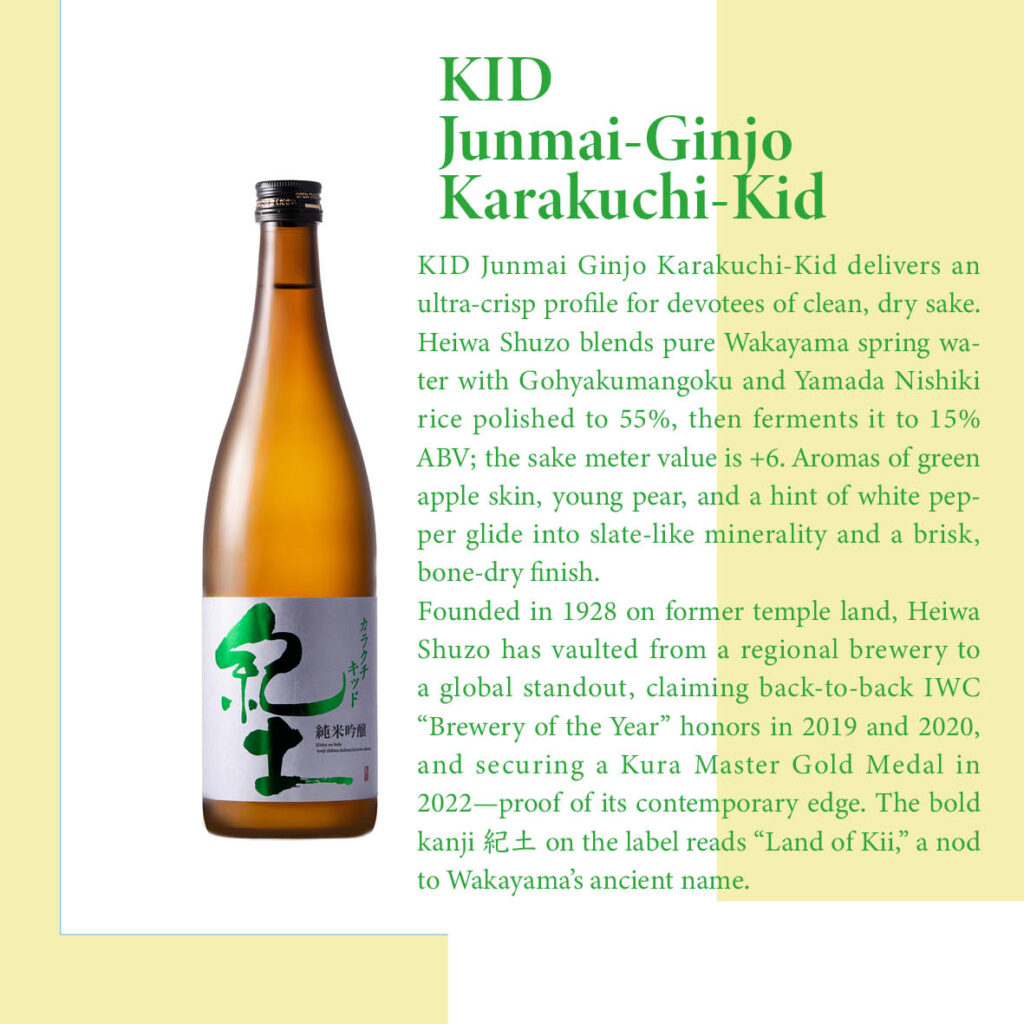 KID Junmai Ginjo Karakuchi-Kid delivers an ultra-crisp profile for devotees of clean, dry sake. Heiwa Shuzo blends pure Wakayama spring water with Gohyakumangoku and Yamada Nishiki rice polished to 55%, then ferments it to 15% ABV; the sake meter value is +6. Aromas of green apple skin, young pear, and a hint of white pepper glide into slate-like minerality and a brisk, bone-dry finish.