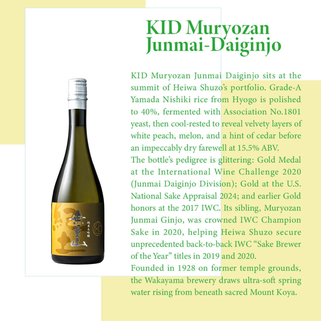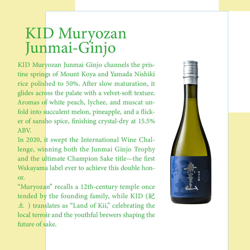 “Muryozan” recalls a 12th-century temple once tended by the founding family, while KID (紀土) translates as “Land of Kii,” celebrating the local terroir and the youthful brewers shaping the future of sake.