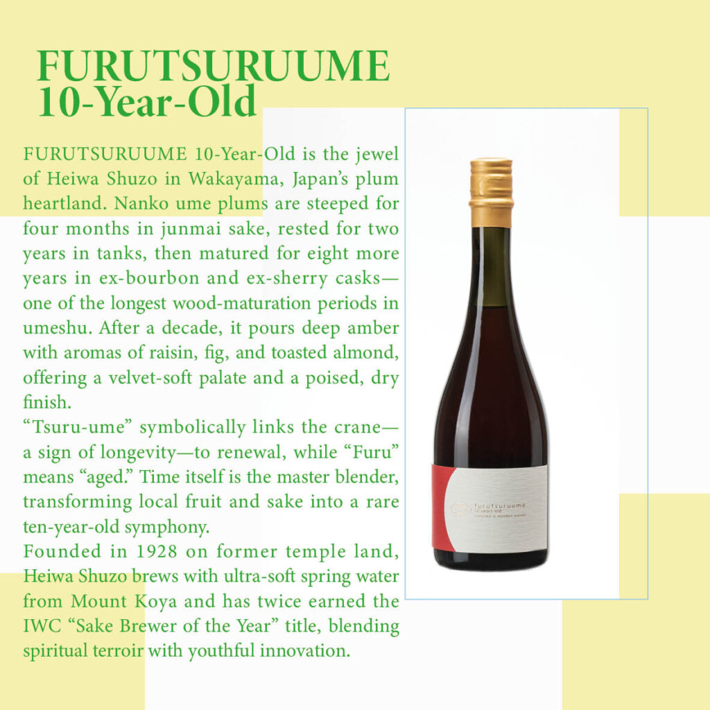 “Tsuru-ume” symbolically links the crane—a sign of longevity—to renewal, while “Furu” means “aged.” Time itself is the master blender, transforming local fruit and sake into a rare ten-year-old symphony.