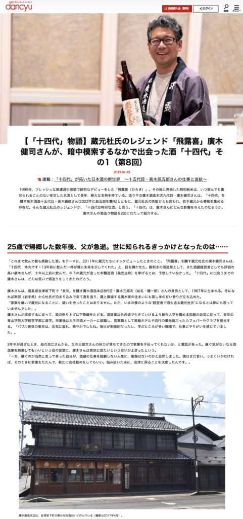 Hiroki burst onto the scene in 1999 with a vivid debut—a fresh, unfiltered, unpasteurized sake. Its later special junmai bottling has enjoyed unwavering popularity for years as a sake you can trust every time. Kenji Hiroki, ninth-generation owner-brewer of Hiroki Shuzō, is hailed—along with Juyondai’s 15th-generation master, Akinori Takagi (who took the name Tatsugoro in 2023)—as a pioneer of the brewer-owner movement and is admired by many young kura heads. This legend calls Juyondai “a truly special sake.” How did Juyondai shape him? We will tell Hiroki-san’s brewing story in two parts.