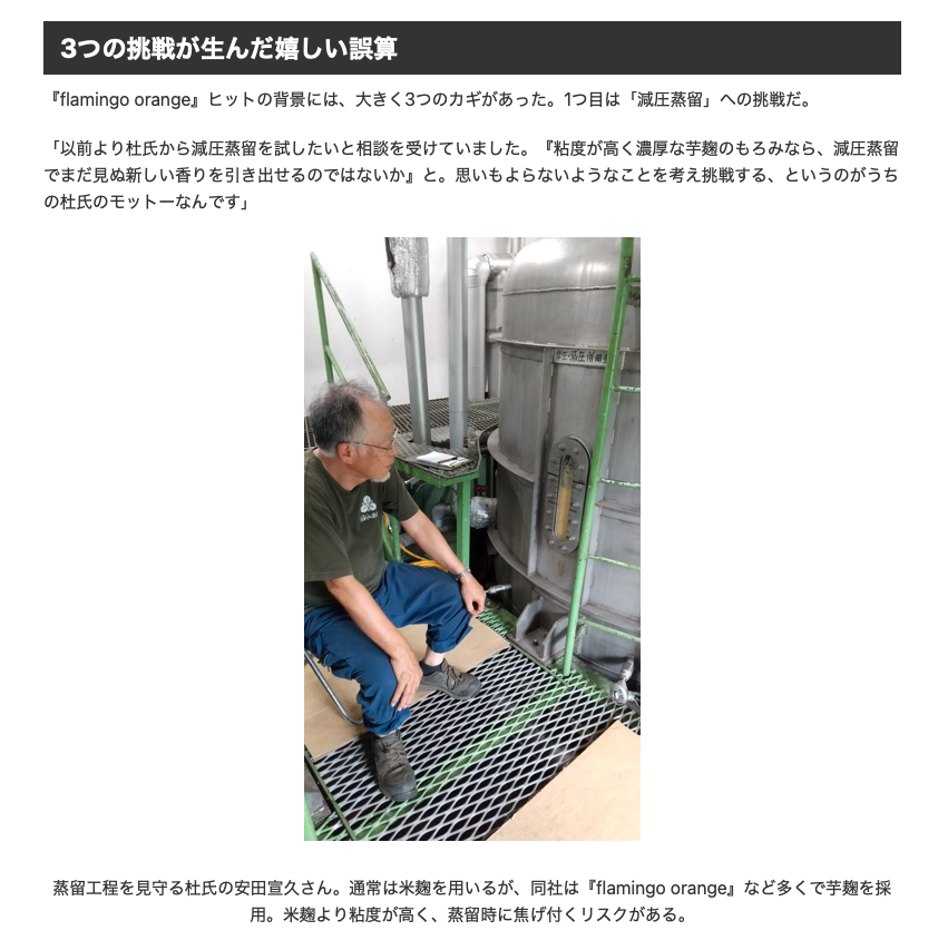 Master Brewer Nobuhisa Yasuda meticulously orchestrates the distillation process. Diverging from the standard use of rice koji, Kokubu Shuzo utilizes a specialized sweet potato koji across its premium portfolio, including flamingo orange. This exceptionally viscous mash introduces a delicate complexity, albeit alongside the meticulous challenge of preventing scorching during distillation.