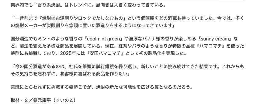 “I attribute much of this triumph to the flourishing shochu-highball culture. The pristine purity achieved through vacuum distillation, coupled with its luscious fruity bouquet, creates a flawless synergy with sparkling water.”